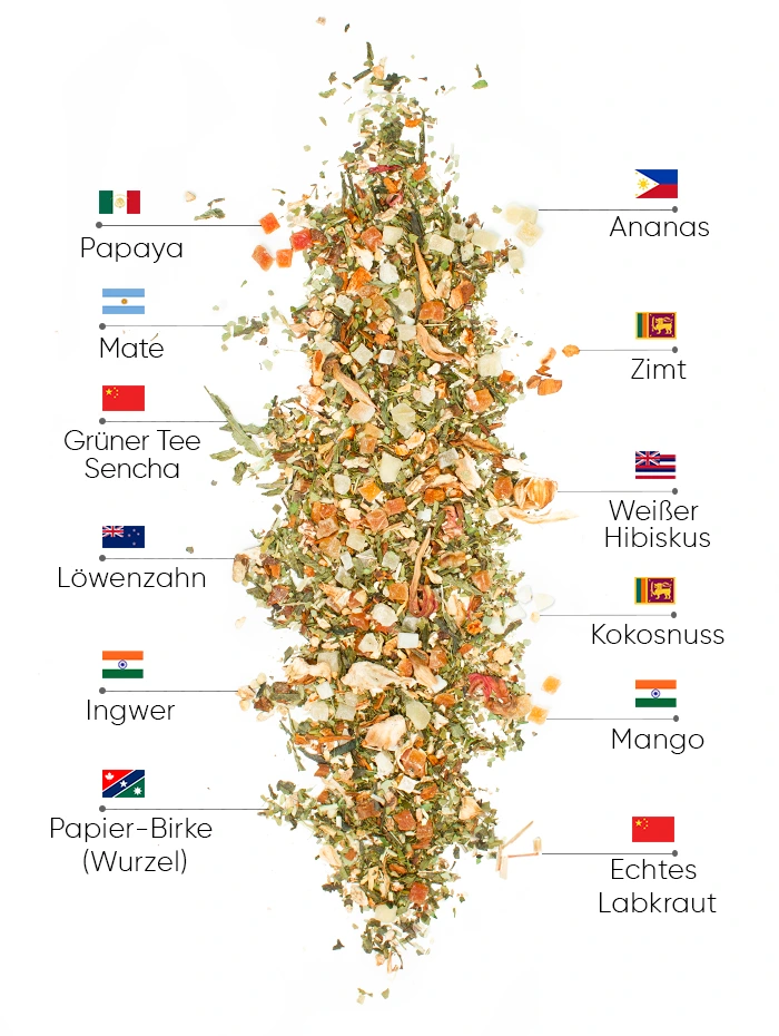 Wenn diese sorgfältig ausgewählten Komponenten in einen Tee gemischt werden, bringen sie den Mechanismus der Gewichtsabnahme in Gang, indem sie auf natürliche Weise den Stoffwechsel beschleunigen, die Fettverbrennung anregen und den Appetit reduzieren – und das sind nur einige ihrer Eigenschaften!