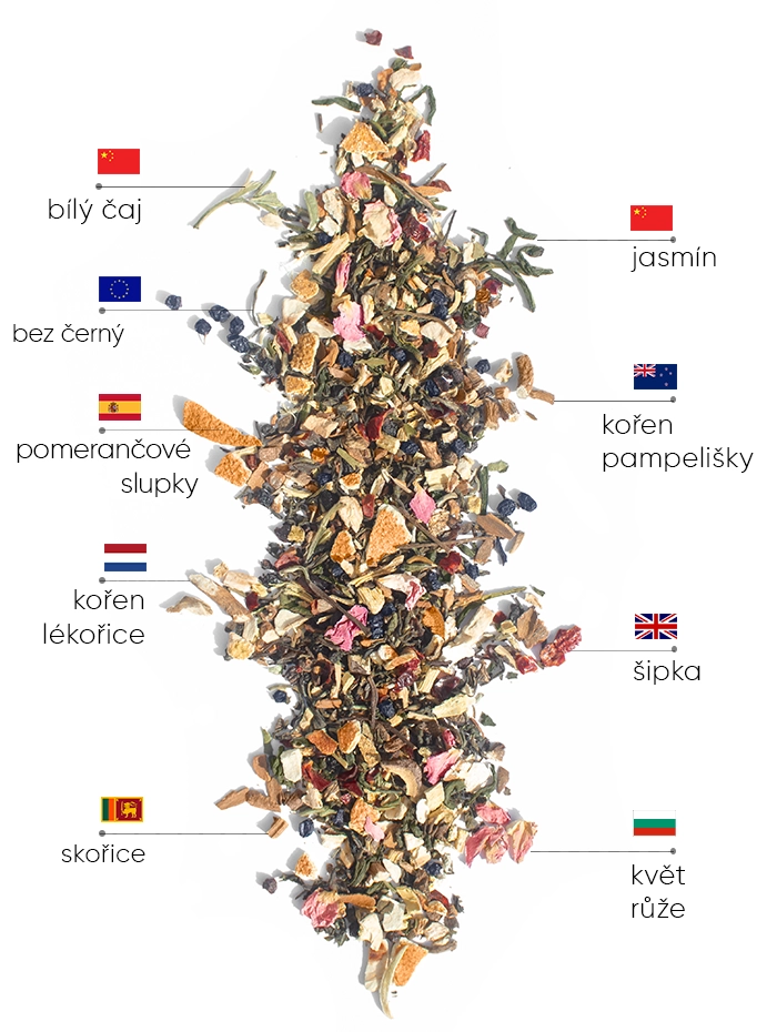 V této čajové směsi jsme spojili jemnou esenci bílého čaje s květinovými tóny jasmínu a lupenů růží. Květy černého bezu propůjčují jemnou sladkost, zatímco kořen lékořice dodává zemitost a hloubku.