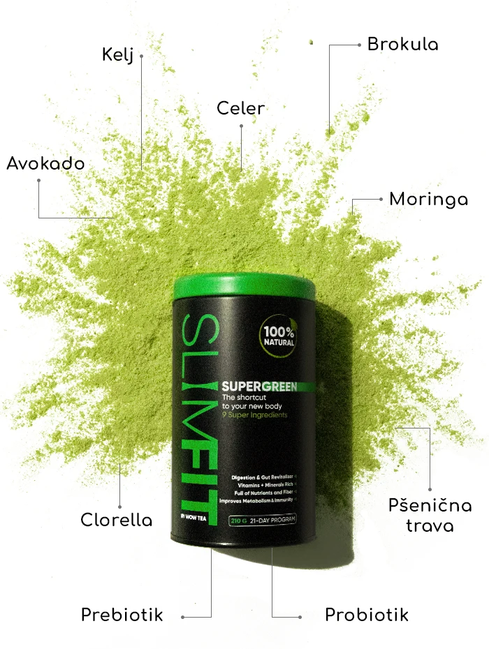 SlimFit SuperGreen je jedinstvena mješavina potpuno prirodnih sastojaka poput moringe i kelja, prepuna minerala, vitamina, vlakana i antioksidansa. Ove supernamirnice zajedno podupiru nesmetanu probavu i promiču zdrav ritam crijeva. SuperGreen pomaže vašem tijelu da u potpunosti apsorbira hranjive tvari, smanjujući želju za hranom i nadutost dok pruža dugotrajan osjećaj sitosti. Za razliku od dijeta koje vam mogu iscrpiti energiju i izazvati jo-jo efekt, redovita upotreba ovog snažnog dodatka daje dugotrajne rezultate. Dugoročno ćete uživati u tanjem struku i ravnom trbuhu. I to nije sve! SuperGreen također potiče vaš metabolizam, pomažući vam da izgubite težinu na prirodan i održiv način, dok istovremeno poboljšava rad vaših crijeva i želuca.