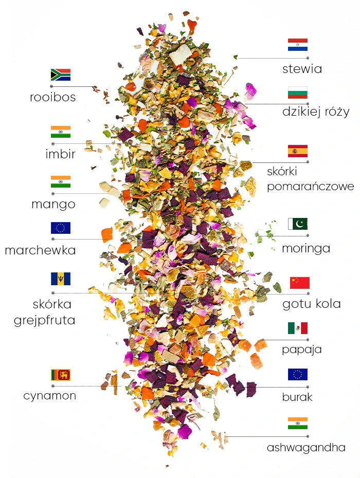 100% naturalne zioła wellness + egzotyczny owocowy smak.