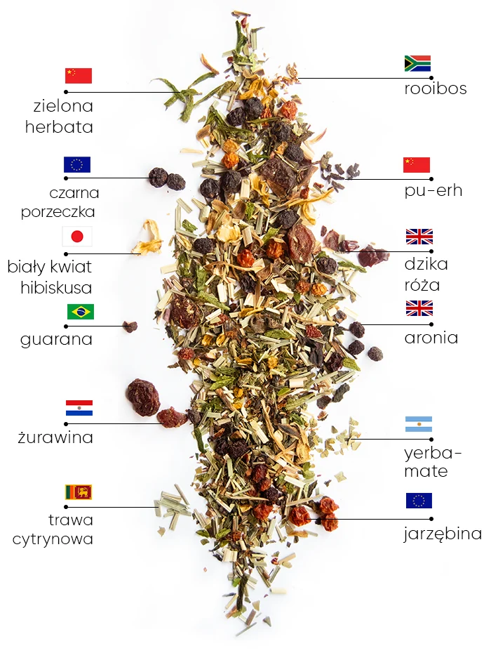 Bogate w witaminy jagody, owoce dzikiej róży i Roibos mają właściwości przeciwzapalne, które wspierają układ odpornościowy i zapewniają liczne korzyści zdrowotne.