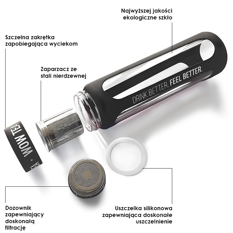 Po prostu wrzuć butelkę do torebki i możesz zaparzyć herbatę i cieszyć się nią w dowolnym miejscu. Jest poręczna i nie przecieka!