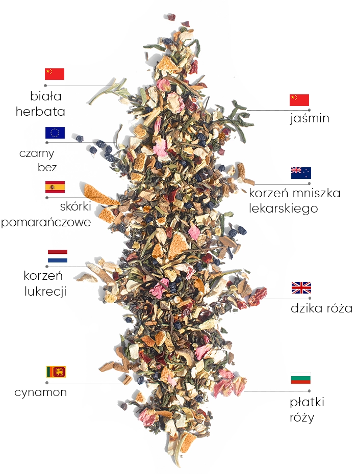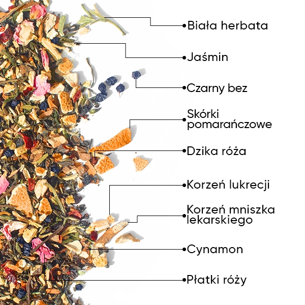 W tej mieszance połączyliśmy delikatną esencję białej herbaty z kwiatowymi nutami jaśminu i płatków róży. Napar z czarnego bzu nadaje subtelnej słodyczy, a korzeń lukrecji dodaje ziemistości i głębi.