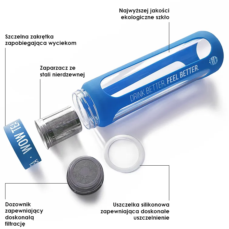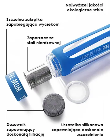 Po prostu wrzuć butelkę do torebki i możesz zaparzyć herbatę i cieszyć się nią w dowolnym miejscu. Jest poręczna i nie przecieka!