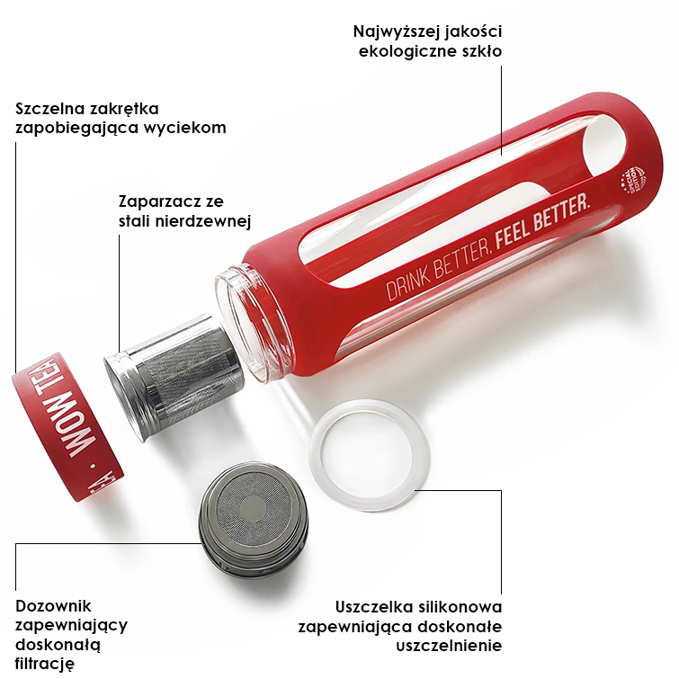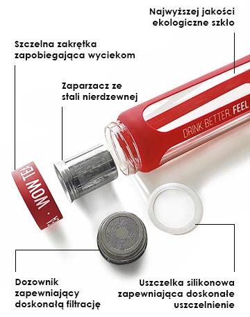 Po prostu wrzuć butelkę do torebki i możesz zaparzyć herbatę i cieszyć się nią w dowolnym miejscu. Jest poręczna i nie przecieka!