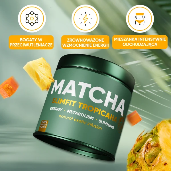 WOW TEA Matcha Slimfit Tropicana to jedyna w swoim rodzaju mieszanka, która gwarantuje smukłą talię, płaski brzuch i ogólną smukłą sylwetkę, jednocześnie zwiększając energię, poprawiając metabolizm, poprawiając trawienie i oczyszczając organizm z zanieczyszczeń oraz nadmiernej retencji tłuszczu i wody.