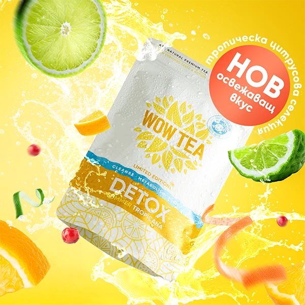 Подгответе се да заредите лятото с нашата нова детокс сензация! В основата си нашият нов летен детокс е базиран на продаваната ни по целия свят класическа детокс формула. Към нея добавихме мощни билки като Бялата Бреза и Еньовчето, за да подсилим бързината на ефекта, тъй като знаем колко е важно да изглеждаме безупречно през лятото. За да сме в синхрон с приятното лятно настроение, разработихме и нов, екзотичен вкус, изграден от селекция на тропически цитруси – лайм, портокал и бергамот. Този освежаващ летен чай започва да прочиства тялото от токсини и задържана вода още с първите глътки. Благодарение на високото му съдържание на антиоксиданти, има и бързо алкализиращо действие, което е изключително важно за киселинно-алкалния баланс в организма.
